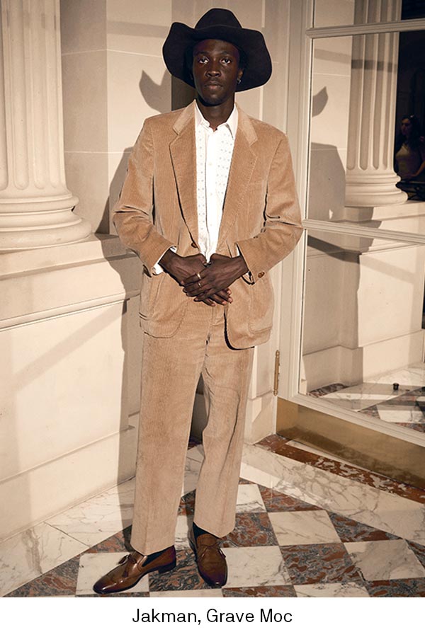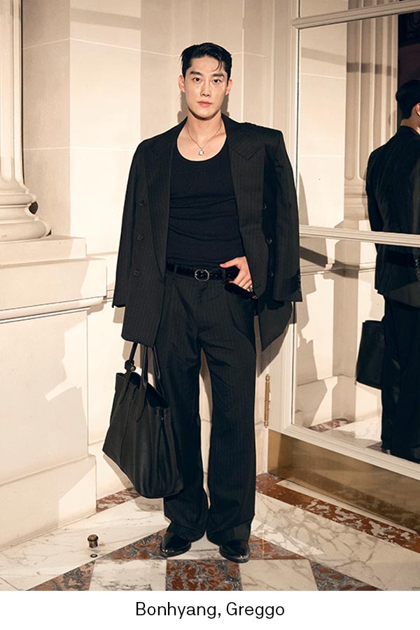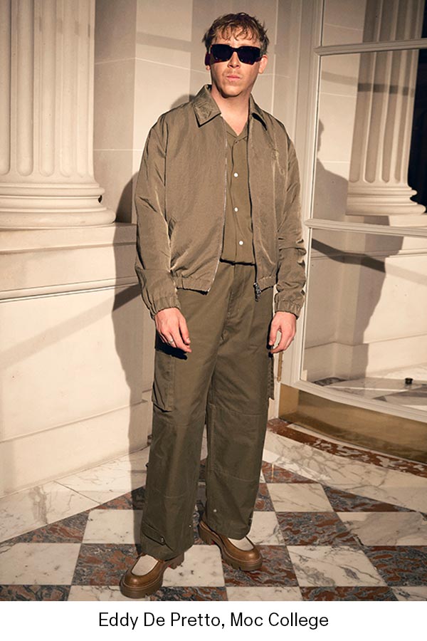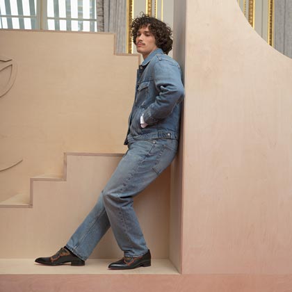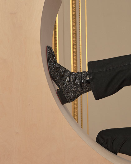 In the Salon des Aigles, four performers portray a poetic cycle of 24 hours of a dandy’s life, brought to life through key silhouettes from the collection. Morning unfolds in the equestrian Lord Chamb boots; nightfall reveals the O Louvre moccasin and Circus Booty Perla — laser-cut, multi-textured boots adorned with 10,000 hand-applied rhinestones and pearls, echoing a harlequin’s collar. The mise-en-scène is framed by two ‘Vitrines l’Éclaté’ illuminating the constructions of the Farfaman and Farfarock shoes.