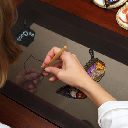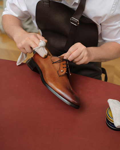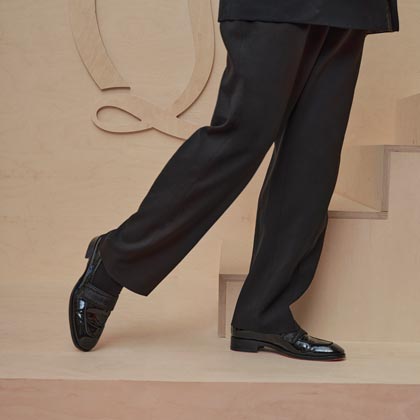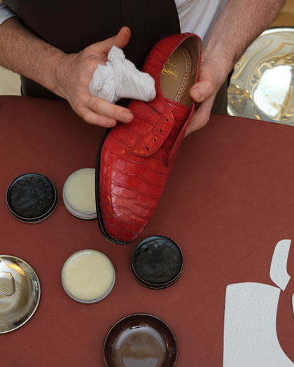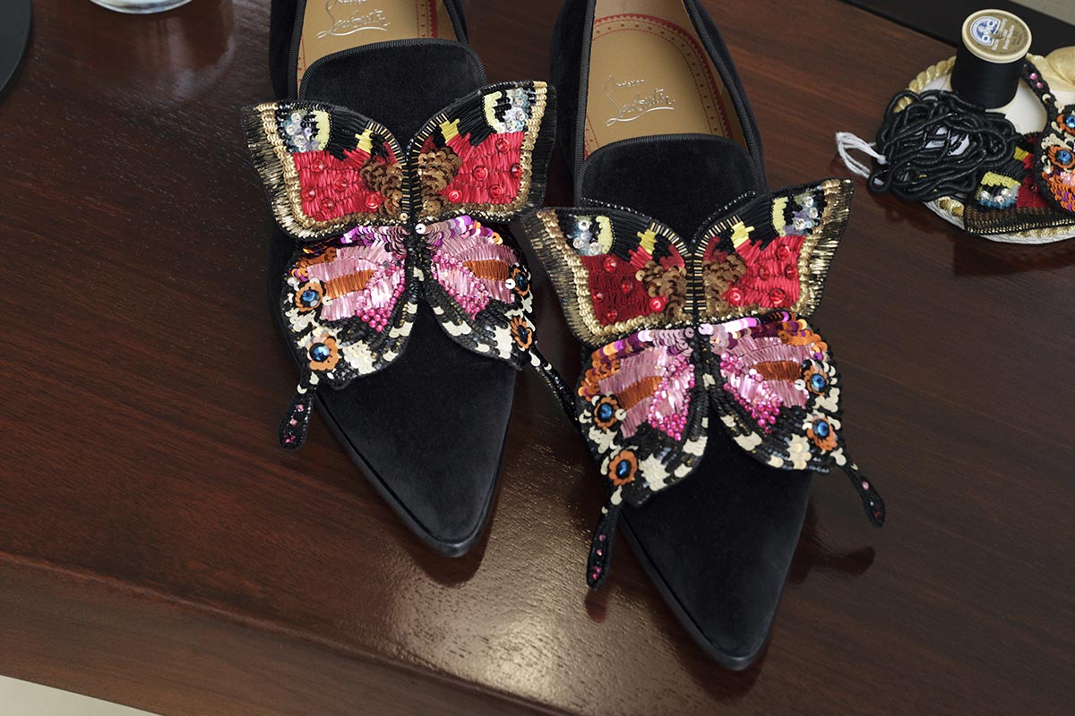 The presentation opens in the Salon des Batailles, offering a glimpse into the creativity that defines each unique pair. Artisans demonstrate three signature techniques: patina and glazing, which give the Chambeliss line its signature depth and shine; and intricate embroidery by the Maison Lesage, adorning the limited-edition Farfajour and Farfanuit shoes with a hand-embroidered butterfly — a poetic tribute to artisanal excellence.